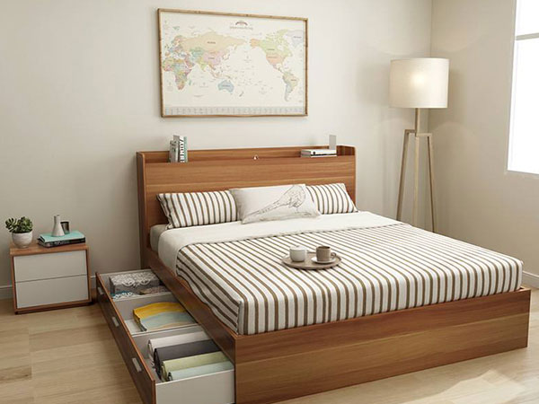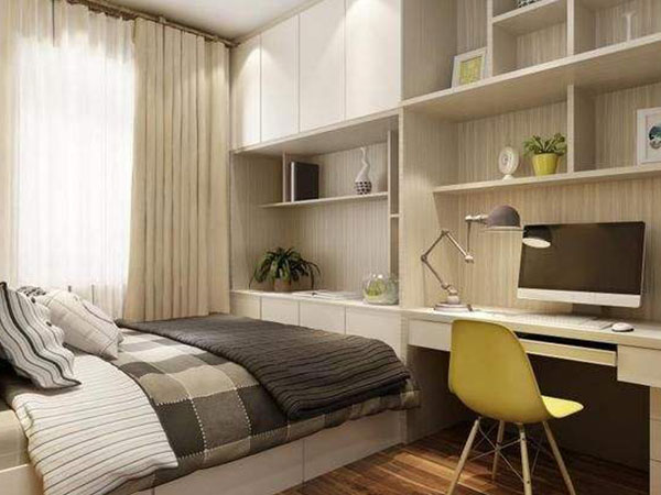 小臥室的面積不夠大,那像床這樣的家具就可以設計成多功能的。比方說床+儲物櫃樣式,將床的下方設計成儲物櫃,收納臥室的一些小物件,省去了收納櫃的安裝;或者是床+書桌,也就是床頭一邊不擺放床頭櫃,設計一個銜接式書桌,也是一種十分不錯的選擇。