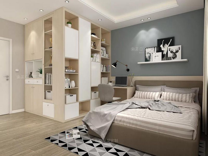 有的小伙伴可能會更注重背景墻的實用性,尤其當房間小的時候,如果背景墻也能用來收納,就能很好地增加儲物空間,提高空間利用率。