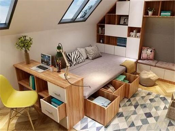 閣樓書房客製化,讓這個角落重新“活化”,可以成為一個獨立書房。榻榻米長凳、床底抽屜、床尾開放櫃都讓這個空間收納變得超級強大。客人來了也可以直接當客臥。