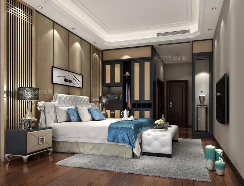 江南水鄉高級煙灰藍+白色,有助于打造室內濃墨寫意的禪意意境,但因為新中式講究留白,所以藍色不宜過多,用在床品、靠墊、地毯這種點綴色上,就會有出其不意的效果。