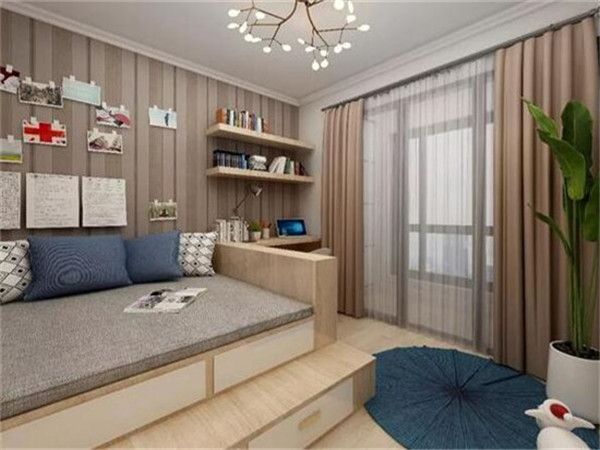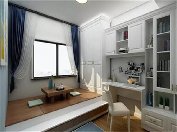 安裝榻榻米的這間臥室,主要功能是書房或者書比較多,可以在榻榻米床的周圍設計收納書櫃,書桌上方的空間可以充分利用,選擇設計成吊櫃。