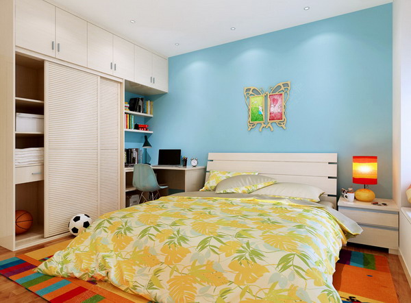 經典客製化案例1:本案中,經典設計師使用的家具風格為現代簡約,自然光澤的楓木色紋理搭配海藍色的墻紙,使整體家居生動活潑不沉悶,適合TA做一場美美的夢。客製化家具的優勢就是空間利用,在有限的使用面積中,盡可能的將多種功能組合在一起,集合了床、床頭櫃、衣櫃、書櫃、書桌等等功能,可儲物可展示,作用分明,一目了然。