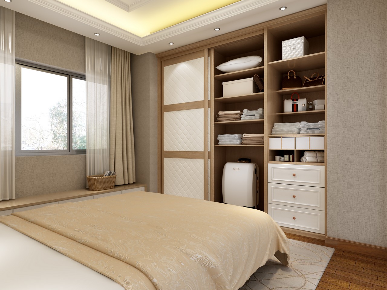 空間考量:客製化衣櫃采用現場量尺定做的特點。充分利用了場地平面空間。通過技術革新,地臺比市面上常見的高108mm減少了40mm,地臺高度僅為60mm,地臺的成功“瘦身”不但大大增加了櫃體的收納空間,提高了空間利用率,而且減磅后的地臺穩重端莊中不失靈巧纖細,顯得秀外慧中,大方得體。