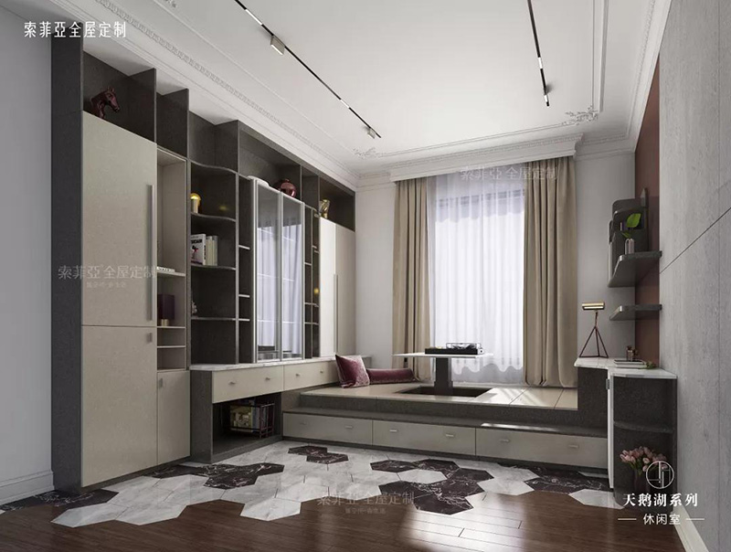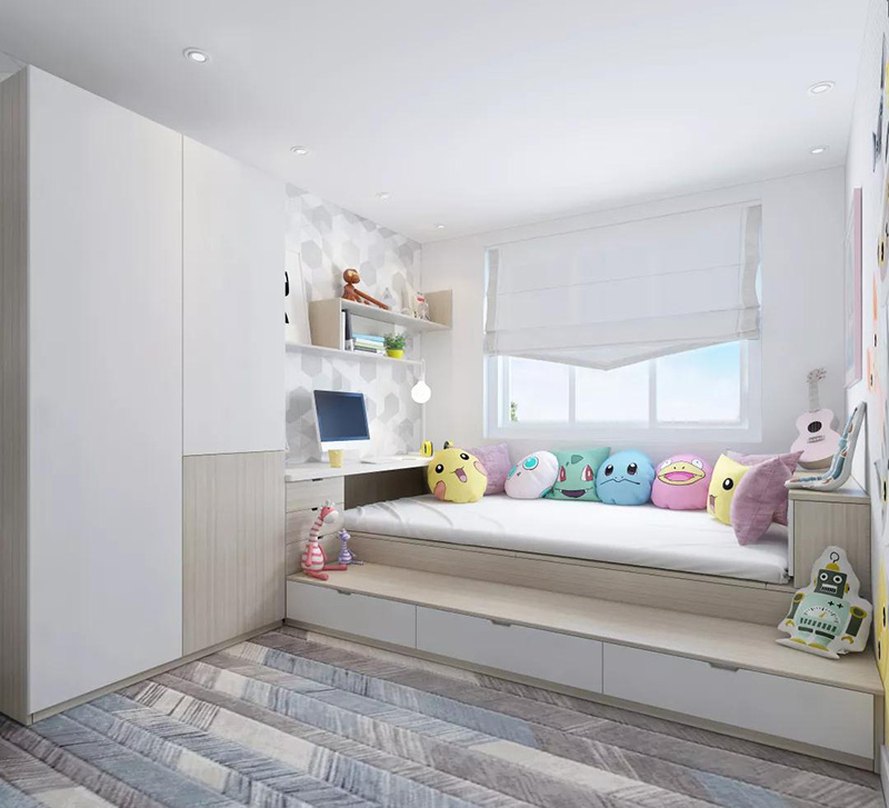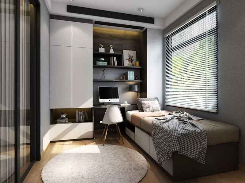 將飄窗櫃直接升級成榻榻米,再組合上書桌書櫃,連成一體,實現臥室最優的動線布局,但需注意一點,要選擇遮光性強的窗簾哦。