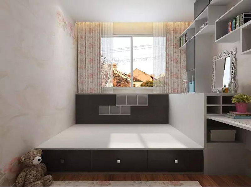抽屜式畢竟要拉出來,會占到一些空間,如果說挪不出空間,還可以利用地臺周圍做各種形式的矮櫃來收納,也是不錯的方法。