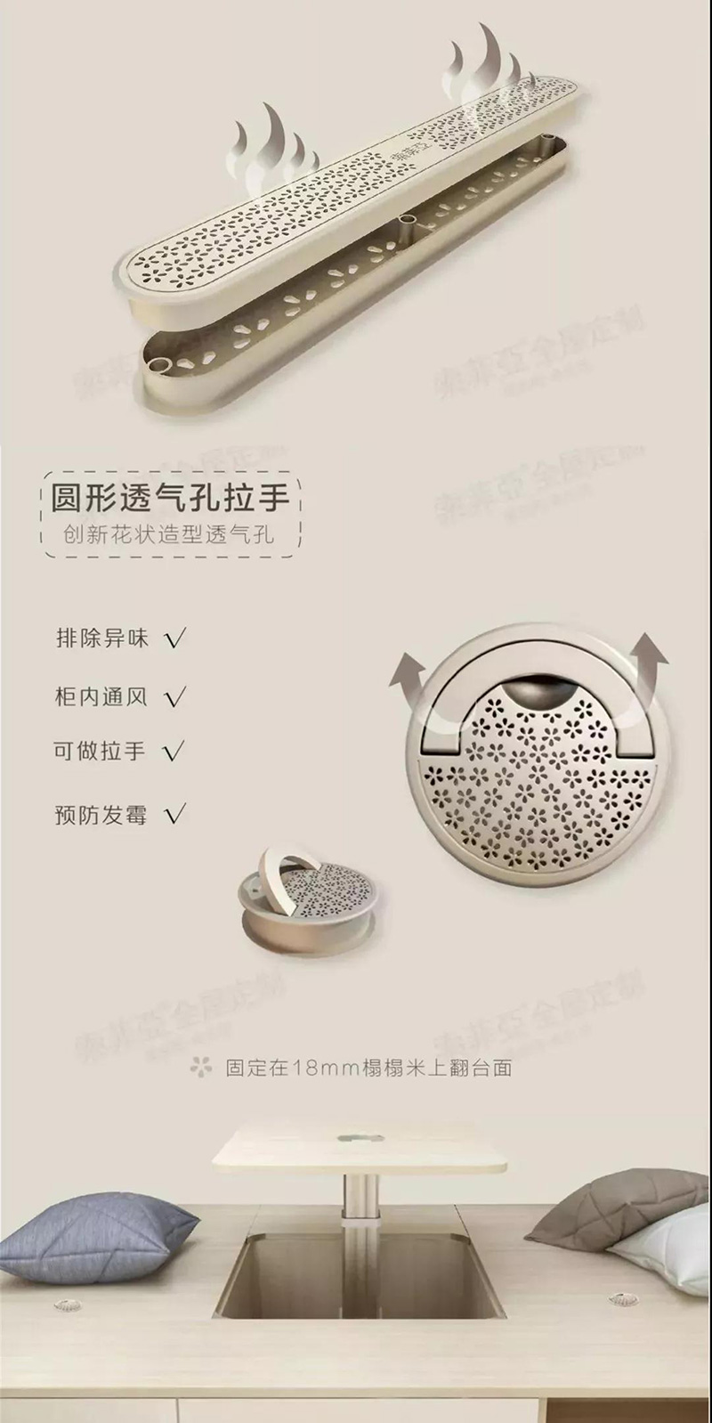 現在的高樓層基本上不會有很潮濕的情況,當然一些南方低樓層地區就不建議了。針對一般的情況,在安裝榻榻時,選擇五金透氣孔或者圓形透氣孔拉手,使櫃內通風,可以很好的發霉,排除異味。