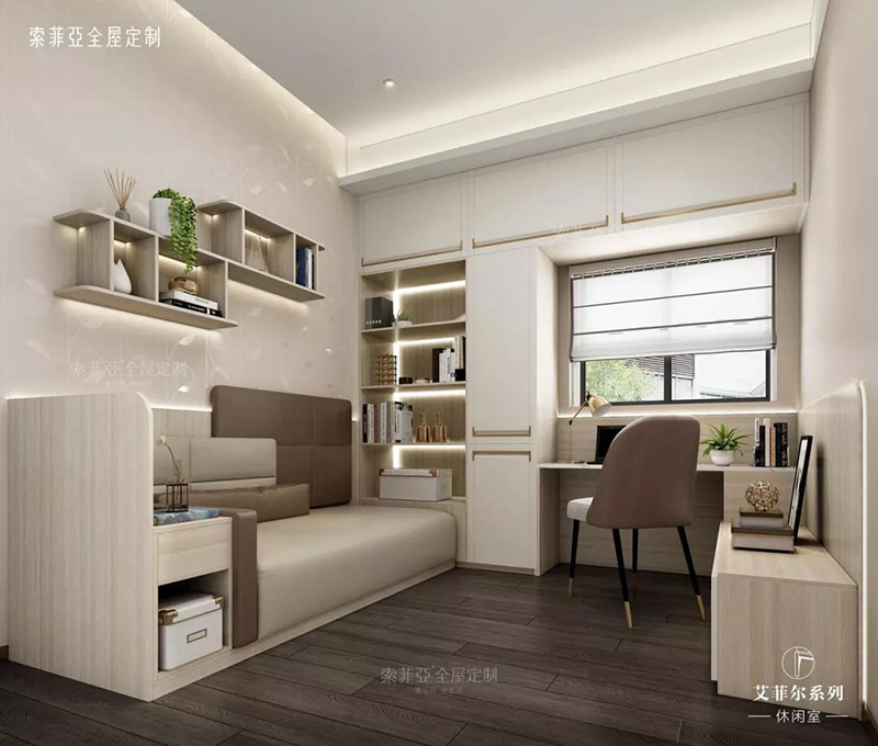對于小戶型來說,書房甚至沒有,有也會充當客臥,如果未來決定接父母同住,還會變成長輩房。一個融合了工作室+多儲物功能+睡覺休息的榻榻米空間,就非常適用在書房。