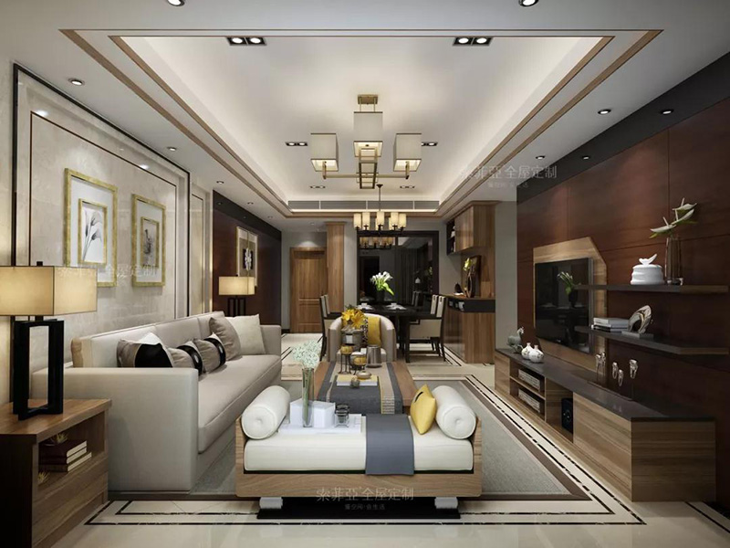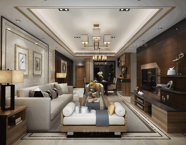 電視櫃線條簡約流暢,胡桃木色+烏木棕色,凸顯新中式特有的質感,中國古工藝品、西方現代雕塑巧妙點綴其中,融合中西文化,透露主人“包容萬物”的處世之道。