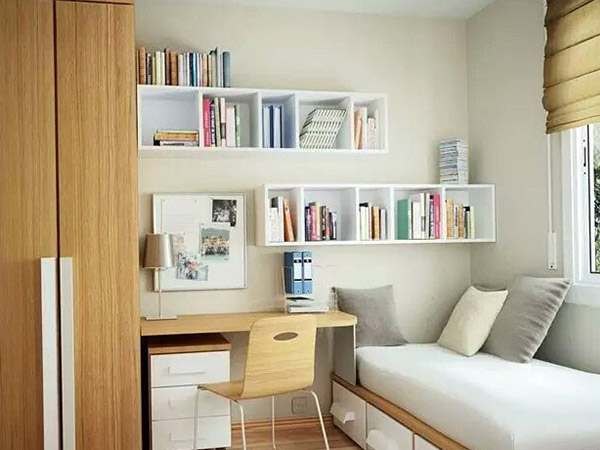 考慮到臥室功能的多樣性,缺少不了家具,衣櫃這些,在小空間里可用的空間就越來也少了,為了更好的給臥室進行裝飾,床頭筆畫、床上方、櫃子都可以很好的利用