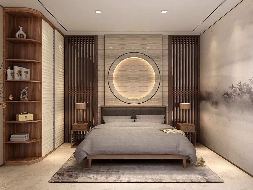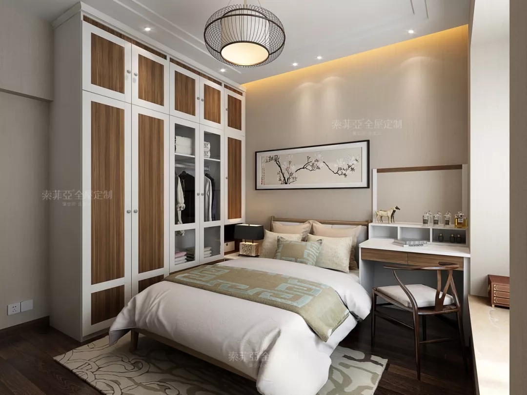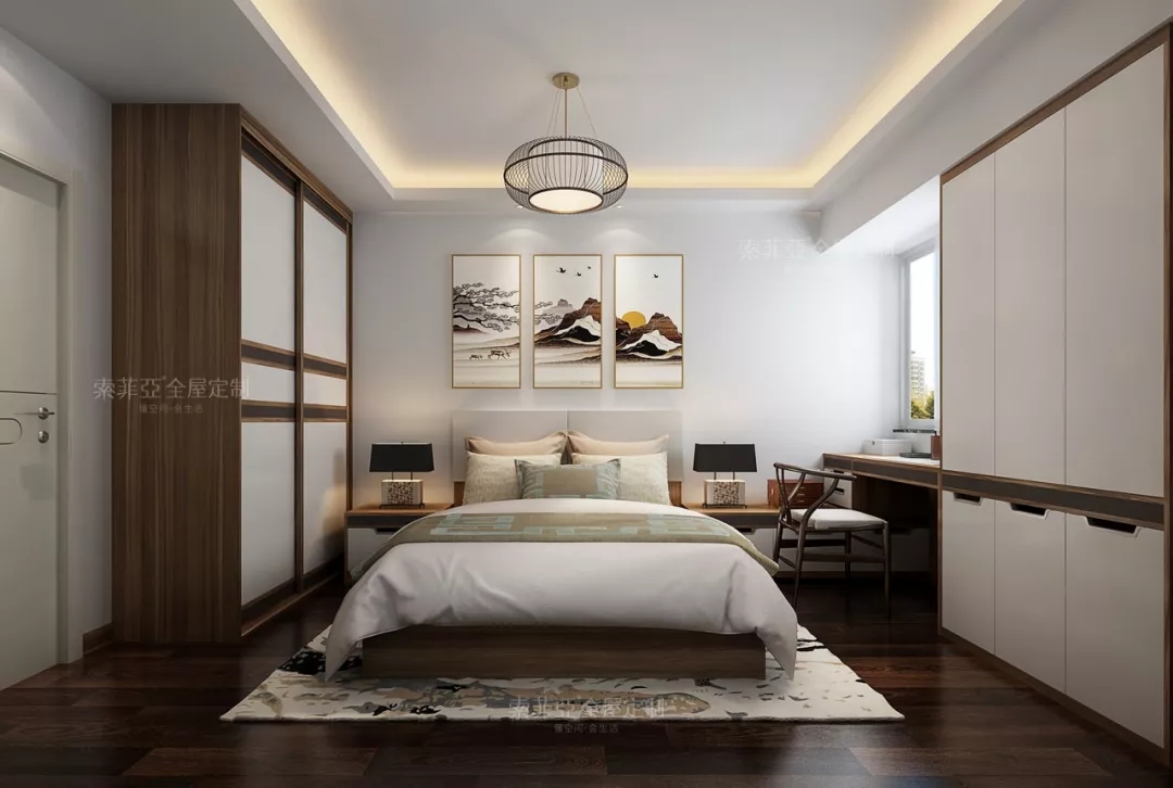 新中式在色彩方面秉承著傳統中式的典雅和華貴,營造出舒適宜居的臥室氛圍。