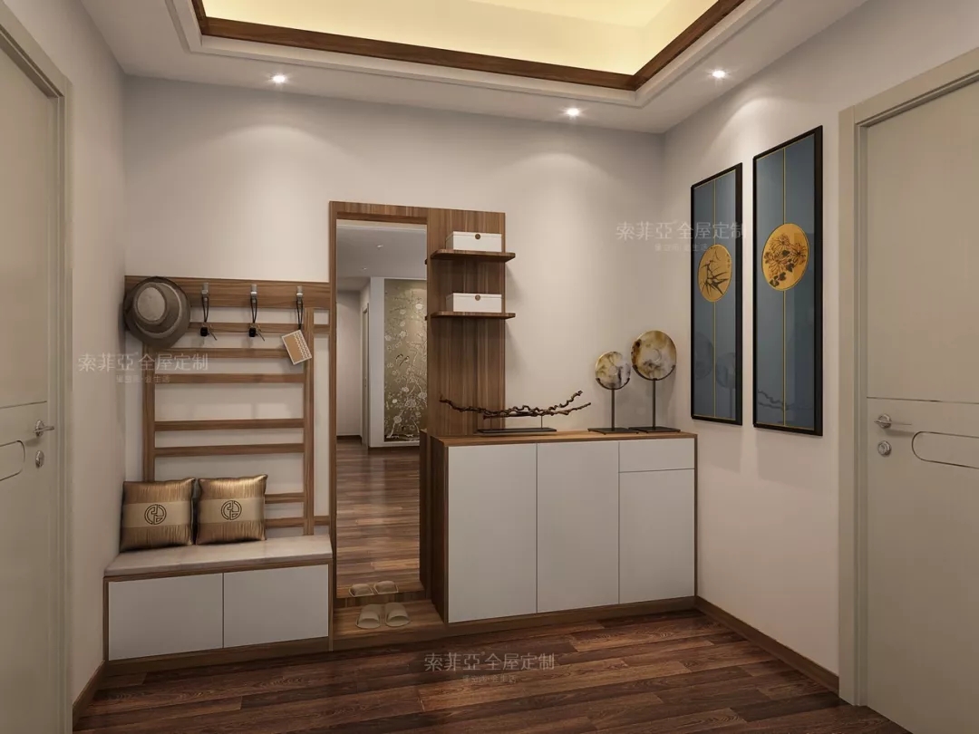 新中式風格家具多以木色為主,搭配有傳統蘇州園林和京城民宅神韻的黑、白、灰的墻面。