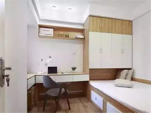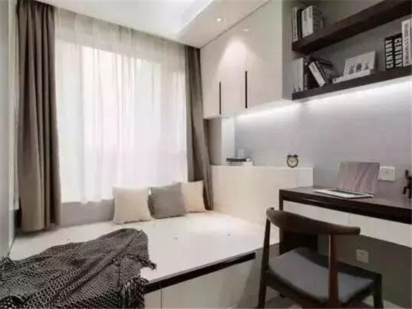 有些房型是2.5個臥室。另外那個臥室小,大概就是一張床的位置。只有這種情況下,榻榻米才有意義。方案是把底部抬高,增加儲物櫃,靠墻位置做長隔板當書桌,兼具了收納、臥室、書房的多重功能。另外可考慮升降式榻榻米,可大限度的利用空間。
