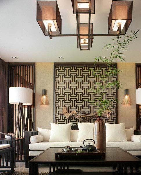 中式風格的室內多用對稱式的布局方式,造型簡樸優美,色彩濃重而成熟。陳設包括字畫、匾幅、掛屏、盆景、瓷器、古玩、屏風、博古架等,各類陳設的放置都極有講究,中式家裝從精神上追求一種修身養性的生活境界。在裝飾細節上崇尚自然情趣,花鳥、魚蟲等精雕細琢,富于變化,充分體現出中國傳統美學精神。