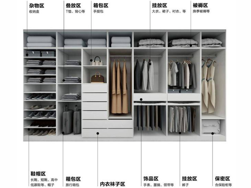 功能區:掛、疊、屜分明,底部設置長抽屜