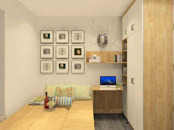 2、如何將全屋榻榻米設計,變為書房、客房、休閑房為一體的多功能房呢,書房部分,可房間左或右側地面留出一個設計榻榻米的空間,在其上方的墻面固定好桌板,做成書桌形式,書桌上方的墻面也可鋪排書架,這樣便能在留出工作區域的同時也不破壞榻榻米的整體性。