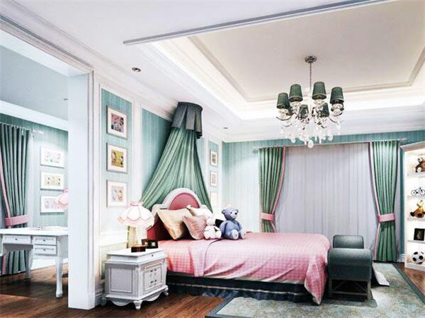 3、豪華的風格也不僅僅只有深色調,這款房間的設計,加上了青綠色和粉色作為元素,有一種歐式皇家的甜美感,是不是容易讓人聯想到公主的閨房呢?