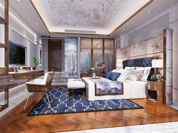 1、一般裝潢豪華臥室,在色彩的選擇上都是比較沉重的,這樣可以體現如金子一樣的厚重感。像淺色系的色調在這里面只會使房間的風格看起來雜亂無章。