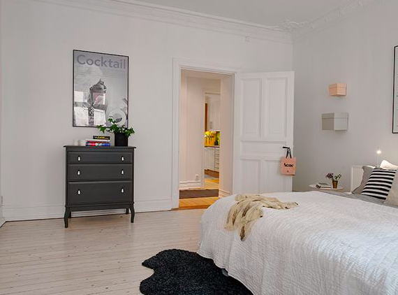 什麼細節?為了避免大家一頭霧水,請聽小編慢慢道來。這里說的細節指的是踢腳線和門套的顏色。踢腳線就是墻邊的包邊,不要小看這個不起眼的設計,它的作用很大的。大家可以試一試,如果你家臥室門的顏色和踢腳線顏色一致的話,會有意想不到的匹配效果,整體感會非常強,看了很舒服。
