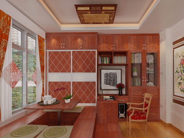 書房的設計可以很好的提升了一個家裝潢的品味,不僅僅是裝潢榻榻米,還有更多的選擇,讓你感受更多的設計,總有適合你,你喜歡的那一款!將書房更加美觀的裝潢起來,一種合適自然的搭配充斥著整個房間,陽光的余暉落在窗臺,感受生命帶來的感動中式風格帶來的浪漫與典雅,將整個書房設計為榻榻米的風格,坐墊與工整的茶幾相互對應,營造出更加的大氣沉穩的感覺