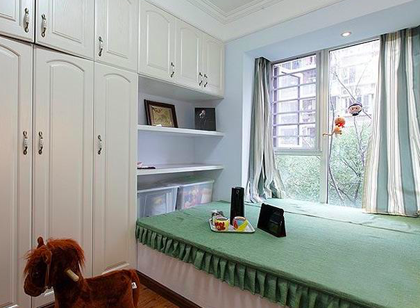 3、臥室的飄窗臺也是很簡單的設計。而且在設計的時候利用了原本L型的樣式,給主人打造了一個小小的休閑空間。像主人那樣在飄窗臺擺上一臺音響,無論是想聽歌還是看書,這個飄窗都可以滿足你。
