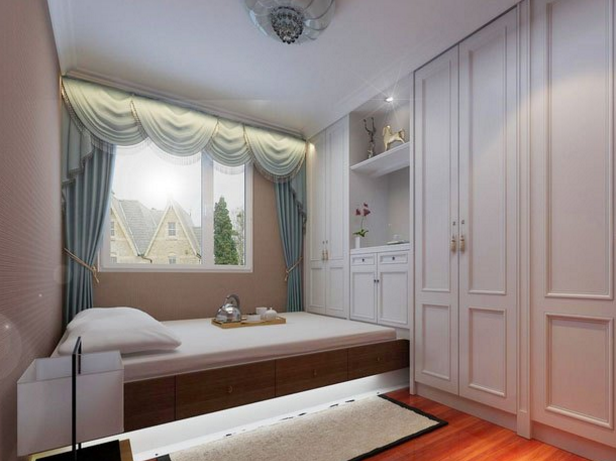 3、這款榻榻米房間裝潢中,在飄窗的空間添加了一個小型的榻榻米設計,這款榻榻米具有自動升降的功能,在悠閑的午后坐在窗臺往外望去,窗外的風景一覽無遺。在有客人到來時將榻榻米降下,榻榻米瞬間變成了一個臨時的臥室空間,美觀而實用。
