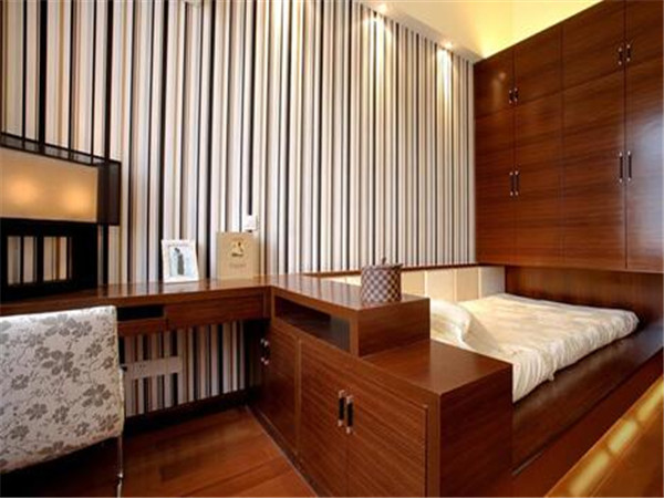 這個榻榻米臥室的家具,大多是由棕色實木打造而成的,收納式床頭櫃造型非常的新穎,條紋壁紙裝飾著墻面,讓整個空間的裝飾變得十分的特別,同時也將臥室布置得格外的時尚。