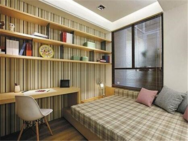 榻榻米取代了飄窗,設計在窗前,透明材質的百葉窗格外的別致,素雅色彩的格子被褥與豎條的墻面相互映襯,讓榻榻米臥室顯得十分的和諧,簡易的三個擱板竟成了收納強大的書架,書桌也同樣的簡單,搭配一張小白椅更是絕配。