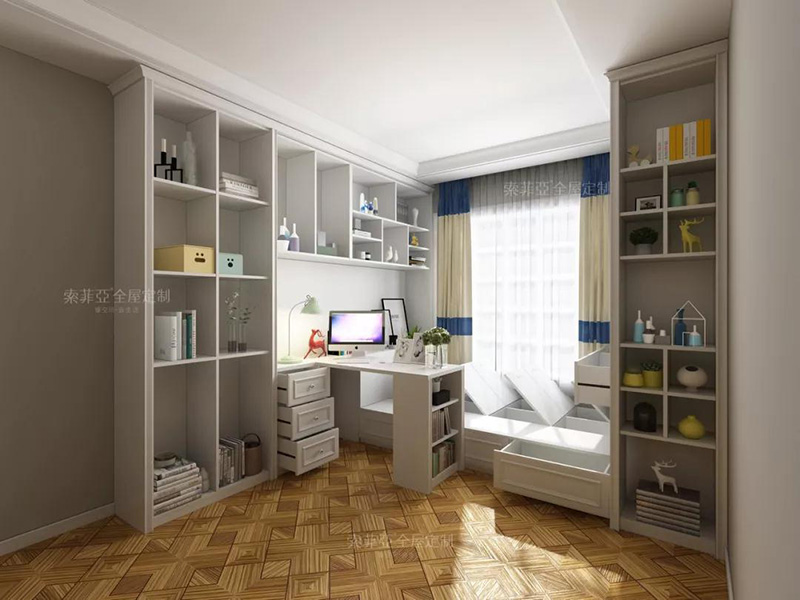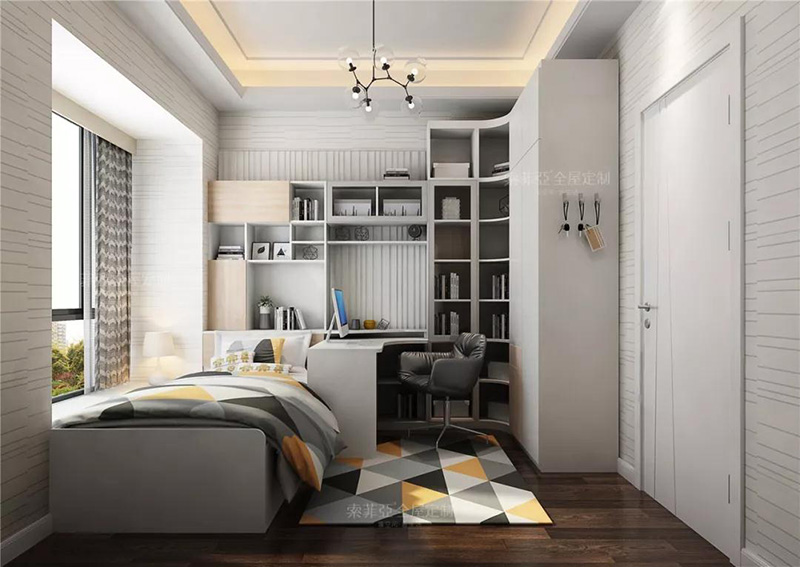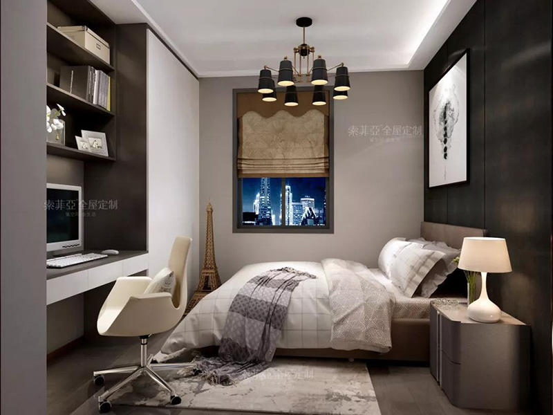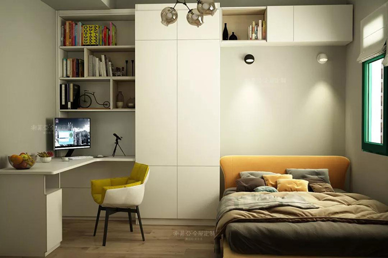 將床頭櫃打造成書櫃+工作臺的組合,讓原本利用率有限的床頭空間得到升華。