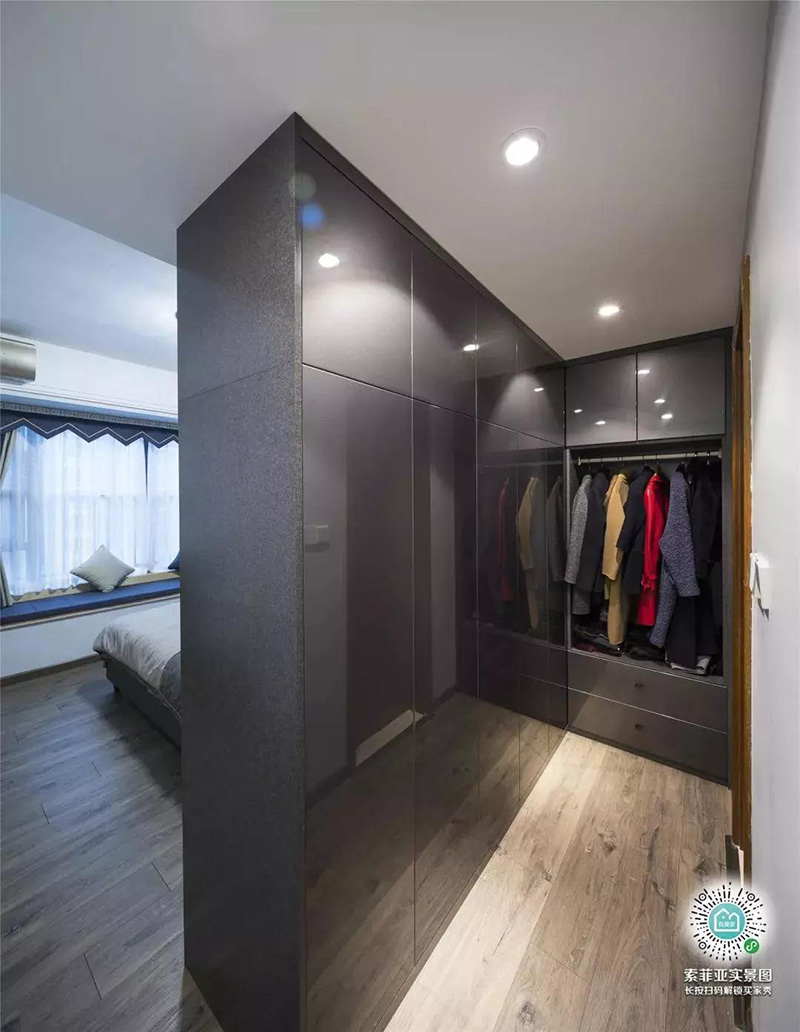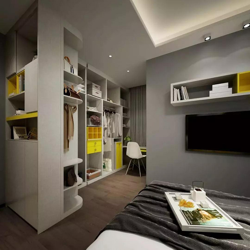 而且L型衣櫃打造出的半包圍區域,拿取衣櫃更方便,在沒法做獨立衣帽間的情況下,L型衣櫃也能小小的過一下“衣帽間”的癮~