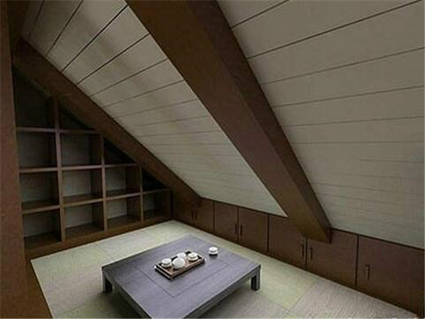 充分的利用閣樓空間,在閣樓里建造榻榻米可以有效的提高空間資源的利用率。房間裝潢顯得穩重又美觀,榻榻米上鋪著奶油色的涼席,上面紋飾著簡單的提花圖案,中間則擺放著一個深灰色的矮幾,旁邊的一側墻壁上鑲嵌著木質的儲物架,上面分布著大小相等的隔間,閣樓的天花板為斜面的設計樣式,給人們帶來不同的體驗。