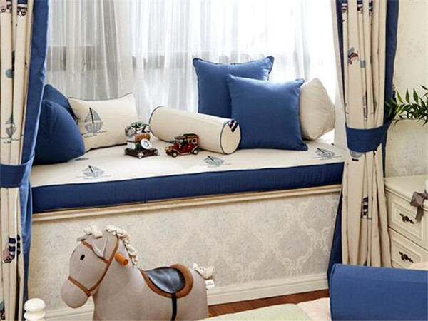 地中海式風格是海洋風格裝潢的典型代表,一定不能少了海洋類裝飾品,在家中就能呼吸海洋的味道。不規則的異形飄窗,神秘的藏藍色與純潔的米白色,過目不忘的藍白風格搭配,窗簾和抱枕融為一體,利用帆船的圖案,躺在其中,仿佛置身在海洋一般,微微的海風拂過,靜靜地聆聽大海的聲音。淺藍色的花瓶配上些綠植,給臥室增添一絲清新自然的味道,表達了對自然生活的向往,流轉著愜意的氛圍。兒童房中不可缺少的當然是治愈系的木馬,造型萌趣,實用性與裝飾性兼顧。