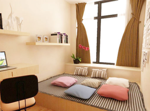 1、小臥室:臥室榻榻米多半是因為房間過小,不能較大化的使用空間面積。建議臥室做榻榻米盡量做一個地臺,旁邊在安裝一個衣櫃、書櫃,這樣可以將東西收納進地臺中,其他物品也可以收納進櫃子中。
