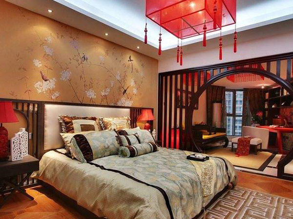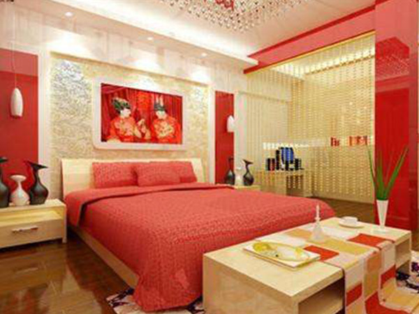 1、在布局時,一般是以紅色為主調,由于這種色系比較艷麗,所以在其它裝飾上不要過于繁瑣,否則會顯得凌亂不堪,另外很多人喜歡在婚房設計中添加氣球、彩紙之類的東西,建議一定要控制好量,適度設計,不要添加太多,否則會增加安全隱患。
