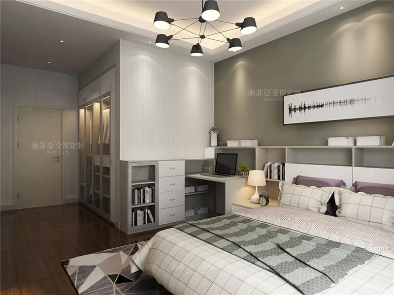 但其實只要稍微升級一下,對空間的利用效果的提高是立竿見影。床頭矮櫃連接書桌,動線流暢合理,又不占空間。