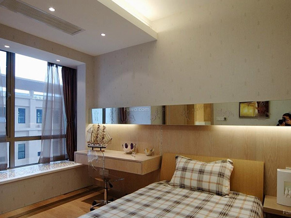 這套簡約風格的小戶型飄窗不僅為居住者提供了一個可以休息的區域,同時也提供了天然的儲物空間。在選擇風格上飄窗采用的軟裝和配飾都達到了最好的效果,靠包、毛毯和窗簾的風格、色調都是相互統一,充滿了簡約的情調。