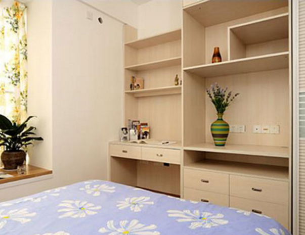 2、轉角設置平開門衣櫃拼接書櫃,線條流暢,干凈利落。素雅的板材帶來幾分大方、隨意生活品質。相鄰的飄窗榻榻米提供了一個不錯的休閑、閱讀區域。整個空間淡雅、素凈,流露出簡約的時尚之美。