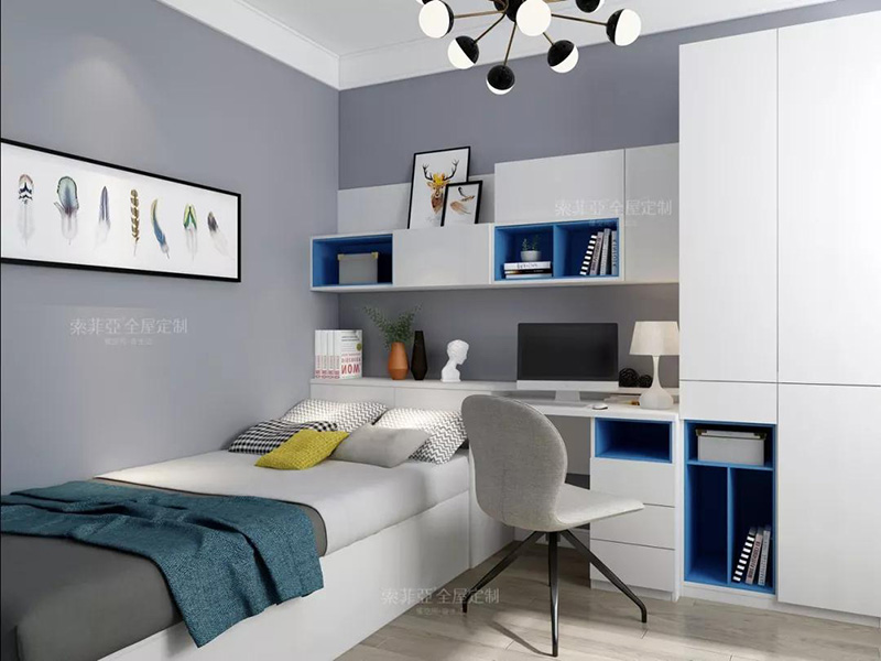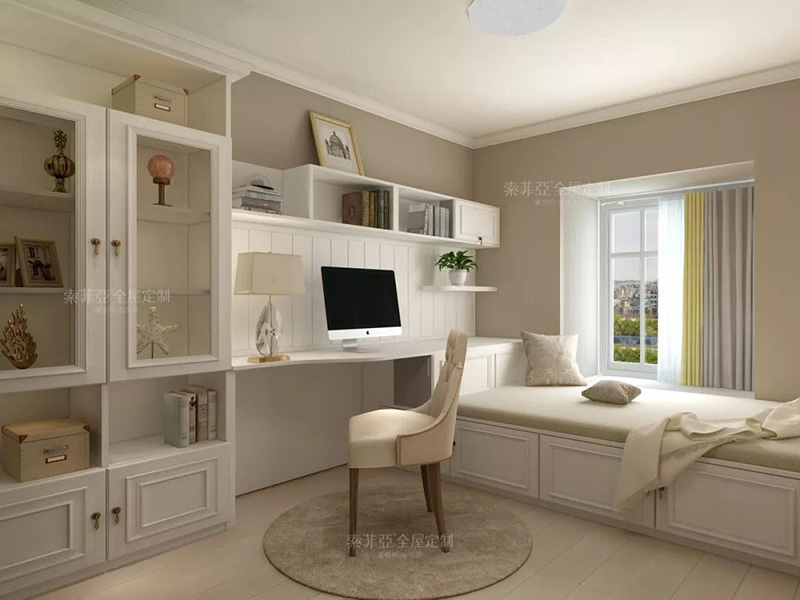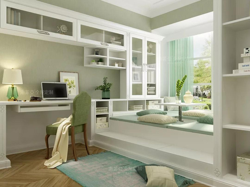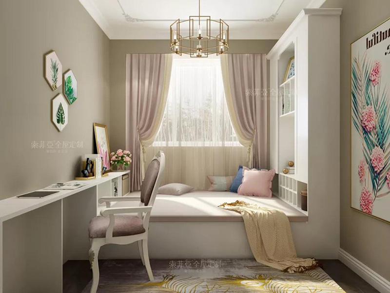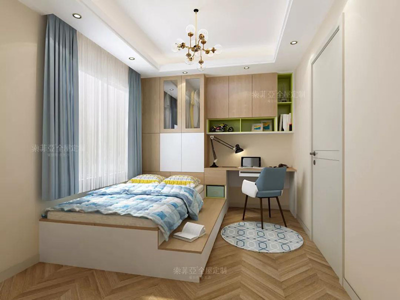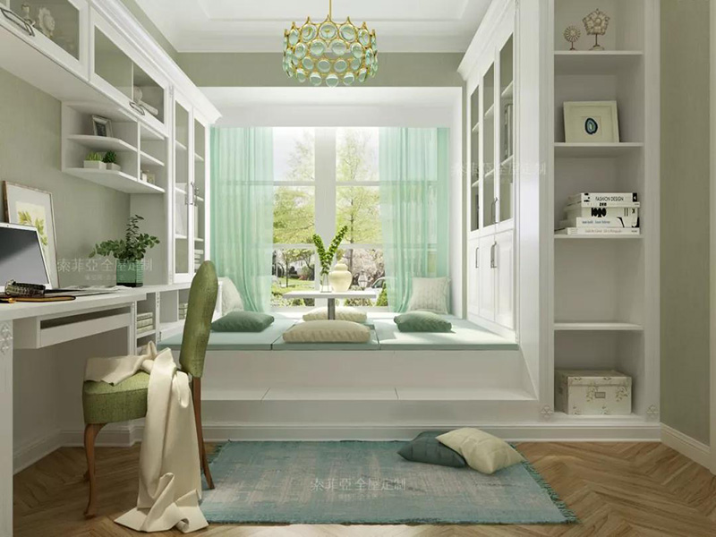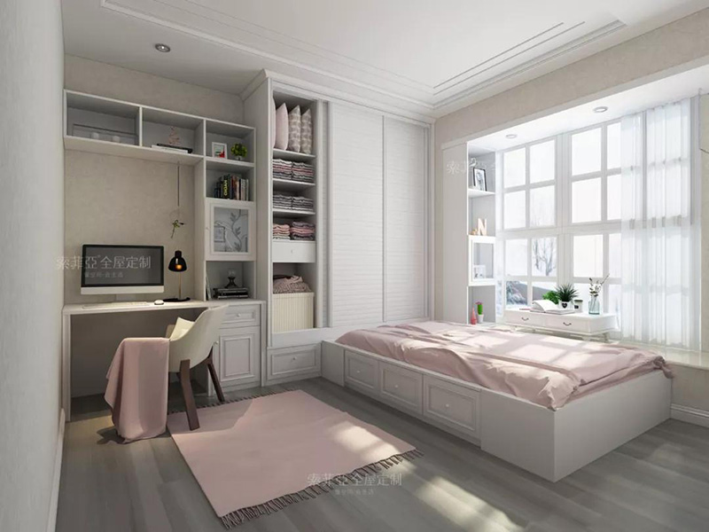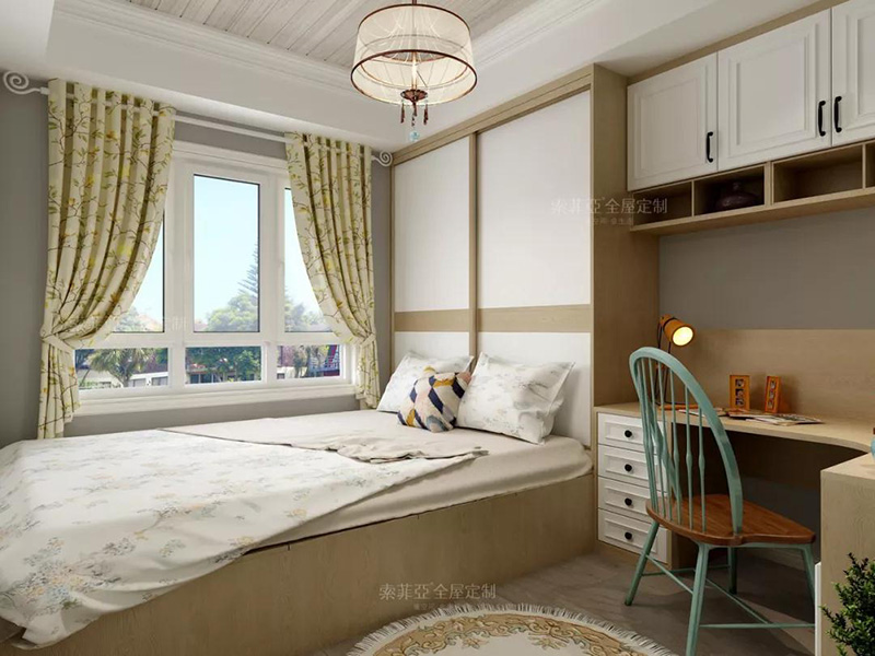 暖白色搭配淺綠色家品,櫃子門板以回型吸塑造型呈現,整個臥室都吹滿輕奢感十足的簡歐風~