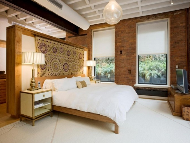2、這間臥室里匯聚了舊和新兩種色彩,帶有舊舊感的天花板與時代感很強的床上設計形成對比,整個房間的顏色搭配,創造一個不拘一格的迷人空間原木的與室內柔黃的燈光想匯盈,床上的冷綠色並不顯得突兀,相反剛好是臥室的顏色像平衡。