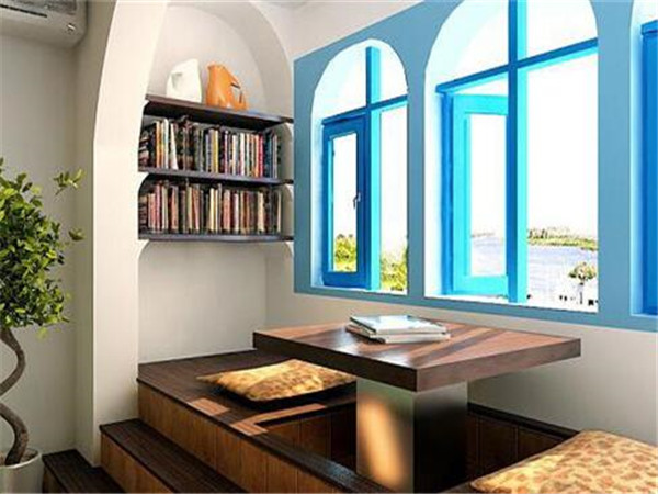 一款地中海風格的榻榻米設計,這款榻榻米采用了地臺設計,在中間設計了一個可以升降的小桌,晚上降下去能作為臥室使用,白天升上來可在上面看書、喝茶、聊天,功能一應俱全。