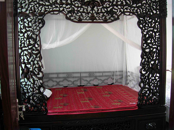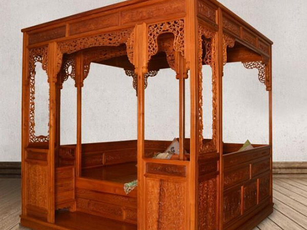 架子床一般可以分為四柱床和六柱床。四柱架子床在明代相當普及,傳統典型的作法是按季節變化選用合適的布材帳子,掛在頂架。六柱床的繁浩結構體現不少大木建筑構件的風格。帳子一般掛在頂架之內,使鏤空攢接的欞格門圍子的裝飾圖案被帳子襯托出來。架子床還可以分為中式風格中的架子床和學生架子床。