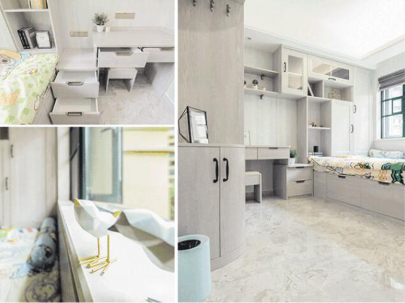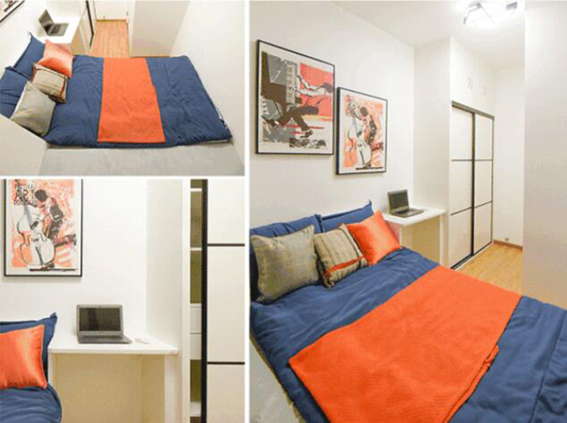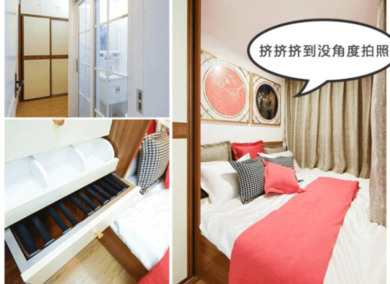 5m²不到的空間,是@小小強的夫妻房,胡桃木配乳白花色的榻榻米和衣櫃設計。在紀念日當天,小兩口重新換上喜慶時尚的床品和掛面等軟裝,決定把未來的日子過成詩。