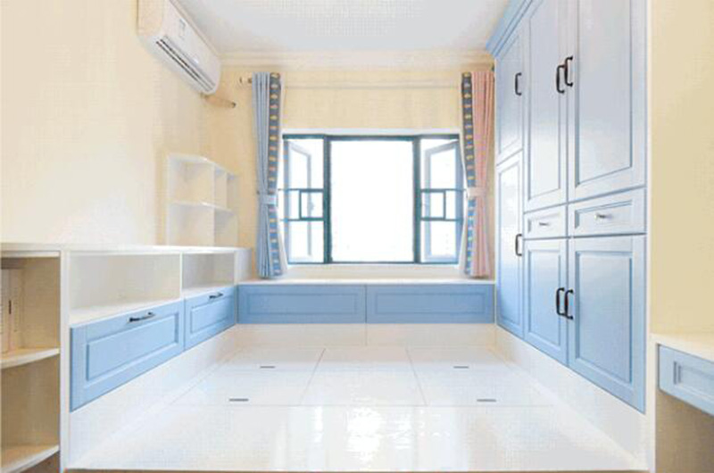 @Ivy家的功能房,藍白色調,清新且具有異域風情。小房間內,集收納、展示、休閑于一體的榻榻米剛好適合她的需求。
