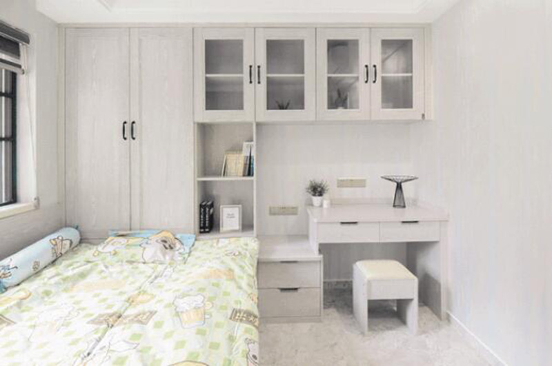 @Lily兒子的房間是淺色布紋+暖白栓木搭配的榻榻米設計。衣櫃到頂設計是明智之選,頂櫃延伸到書桌區域,視覺和諧絕不壓抑。素淡的色調非常適合給孩子自由布置各種軟裝。