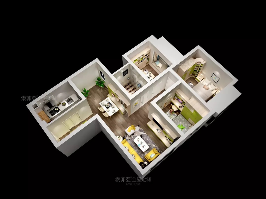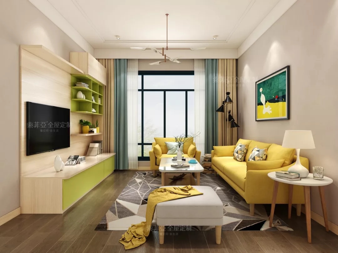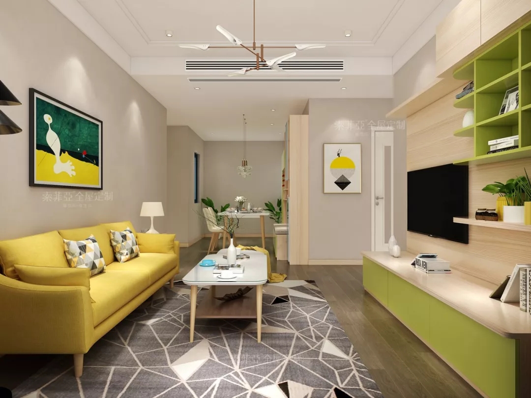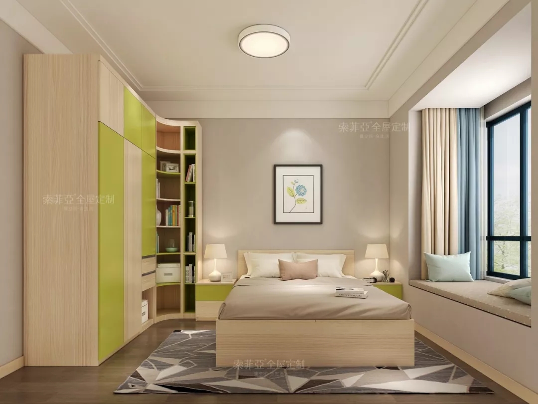 新草綠和楓木色的搭配,貫穿了全屋的每一個空間,讓家居氛圍給外舒適宜人。