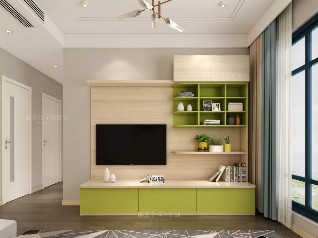 電視櫃以實用至上,一字地櫃和儲物格滿足客廳的基本生活需求。簡單的木質背景墻,讓視線舒緩不壓抑。