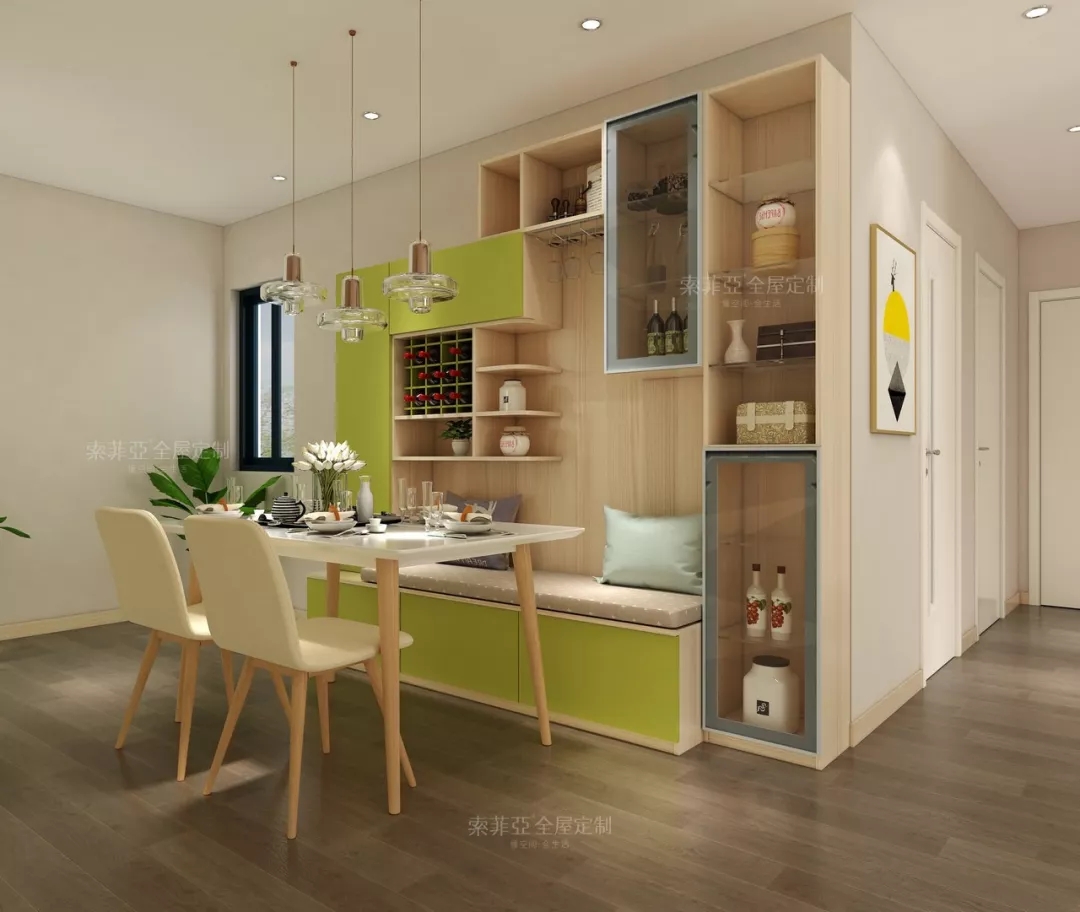 一來,卡座式設計大大節省過道空間;二來,卡座下部空間又能進一步擴大餐邊櫃的儲物能力,相輔相成。