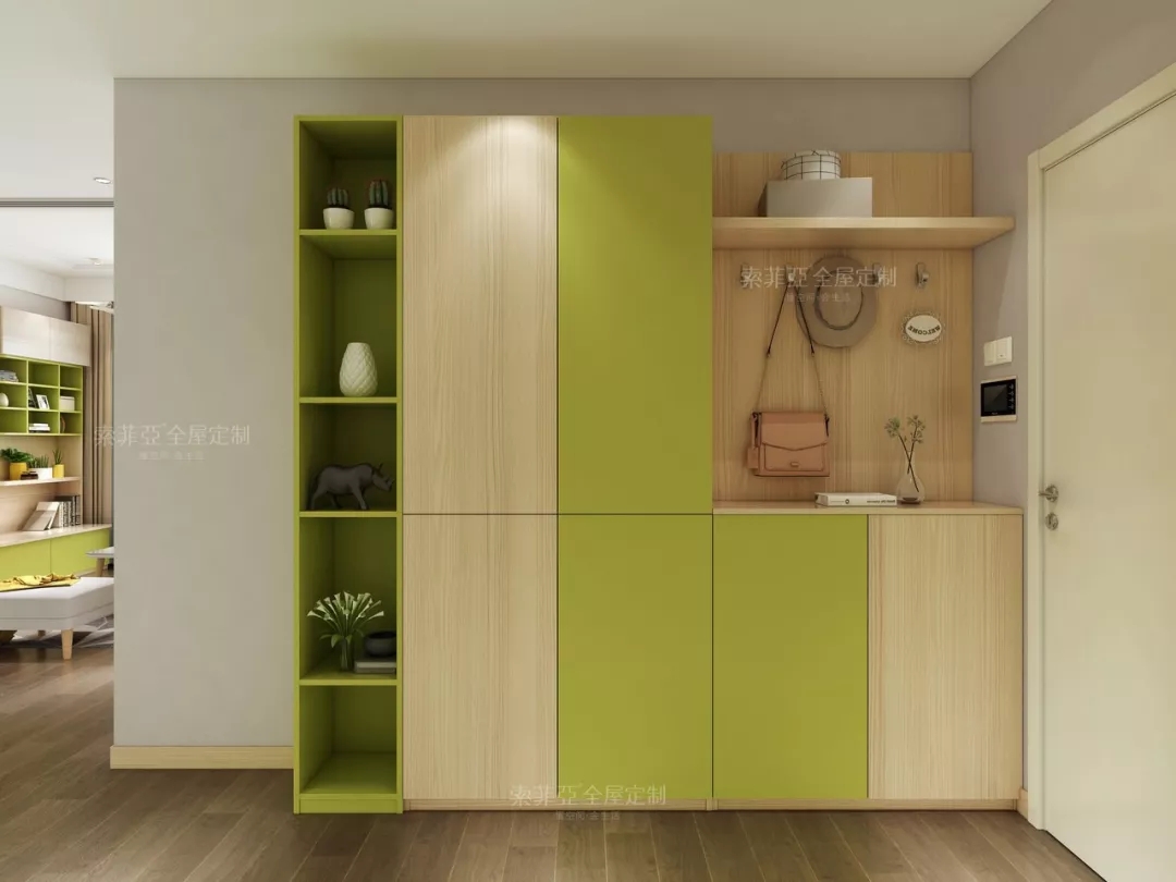 新草綠搭配楓木色的入戶櫃,整個玄關給人一種凈、透、亮的質感印象。
