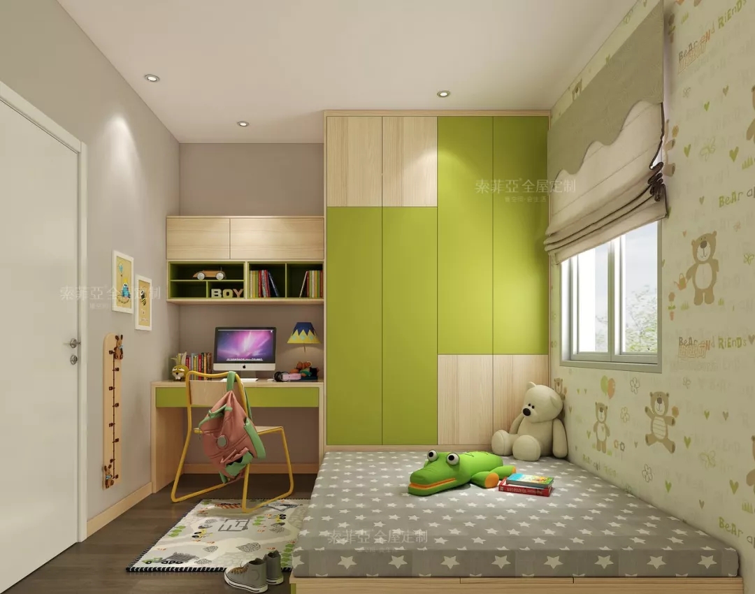 兒童房將衣櫃藏身于床頭后方,利用墻面打造儲物、收納、學習功能完備的臥室空間。