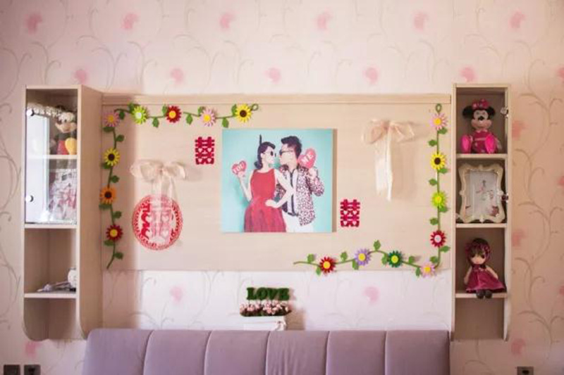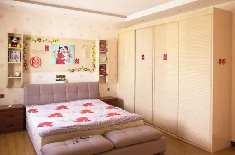 還有一張婚房的“正面照”,可以看出衣櫃、床、梳妝臺等整體設計還不錯,只是床品不太搭調。