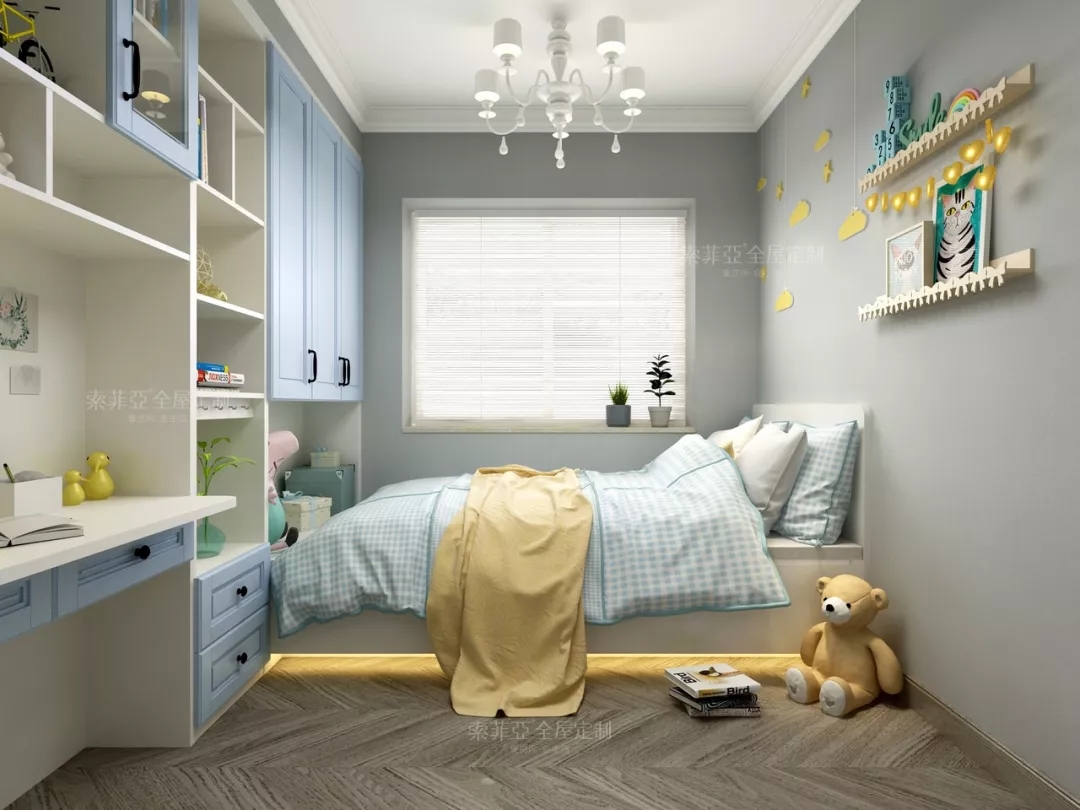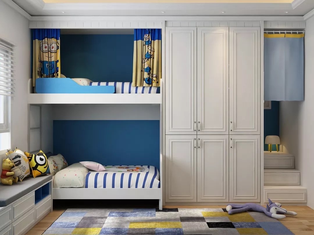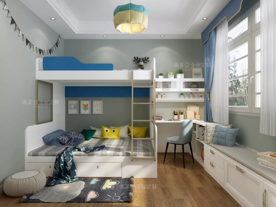 如果是二孩的房間,還能設置一字型雙架床。讓兩個寶寶相互獨立之余還能有足夠的活動空間。